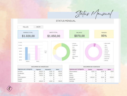 Plantilla de Seguimiento de Ingresos y Gastos Mensuales en Google Sheets y Excel - Modo Oscuro